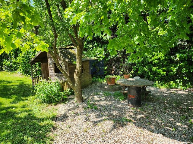 A magnificent hundred-year-old tree in the middle of the land will fill you with freshness and shade during the summer. Three garages (one of which is rented) complete the whole.