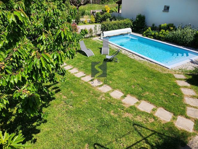 The DPE currently in D because of oil heating would be in B with a heat pump as the renovation and insulation are of high quality. A fitted kitchen, quality double glazing with Alu windows and bay windows, 100 and 120mm wall lining, 300mm insulation under the roof, a pellet stove in the living space, a borehole for automatic watering, a 4x8 swimming pool with roller shutter, central vacuuming.