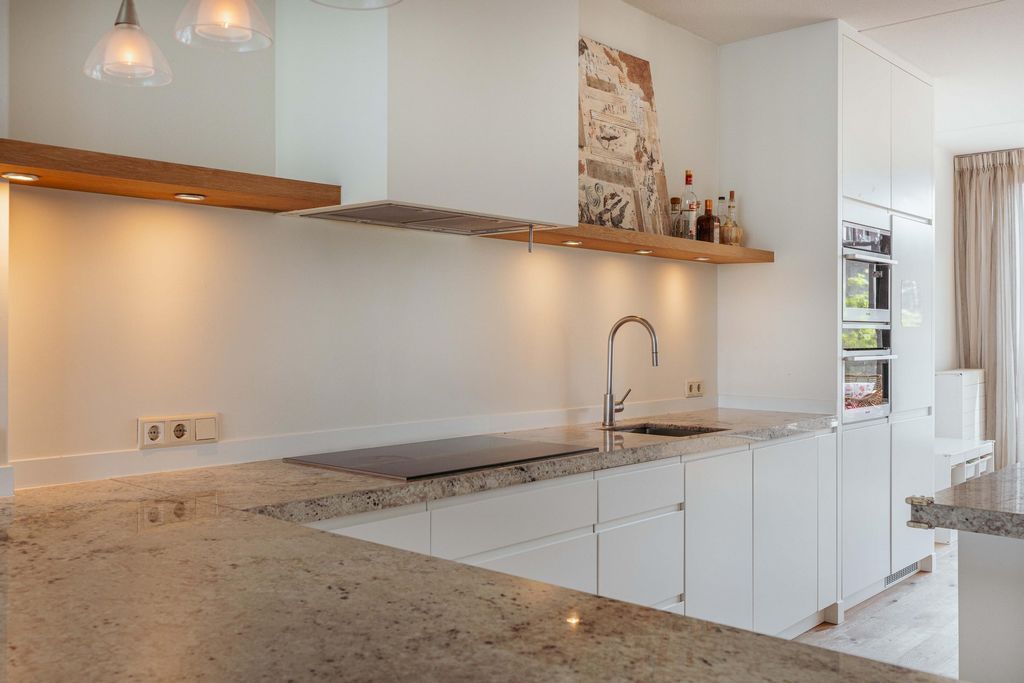 Den rymliga receptionen leder in i en andra hall som ger tillgång till det generösa vardagsrummet med öppet kök. Tack vare fönstren i full bredd och från golv till tak på framsidan kan du njuta av en fenomenal utsikt över IJ. Dubbeldörrar på baksidan vetter mot den soliga terrassen i västerläge på cirka 14 m² - en härlig plats att koppla av utomhus.