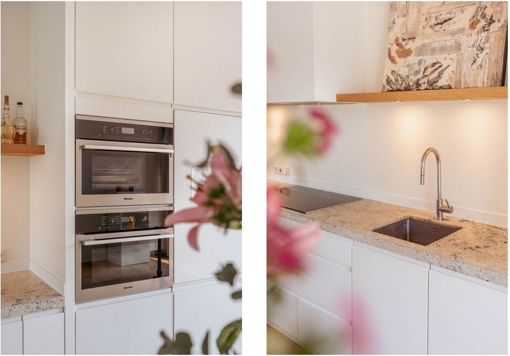 Роскошная открытая кухня оснащена стильным кухонным островом, винным климатическим шкафом и высококлассной встроенной техникой, включая холодильник, морозильную камеру, индукционную варочную панель, посудомоечную машину и две духовки. В квартире три спальни: две спереди и одна, тихо расположенная сзади рядом с террасой. Современная ванная комната оборудована ванной, душевой кабиной, двойной раковиной и туалетом. Также есть отдельный гостевой туалет с умывальником, просторная внутренняя кладовая с подключением стиральной машины и дополнительная кладовая.