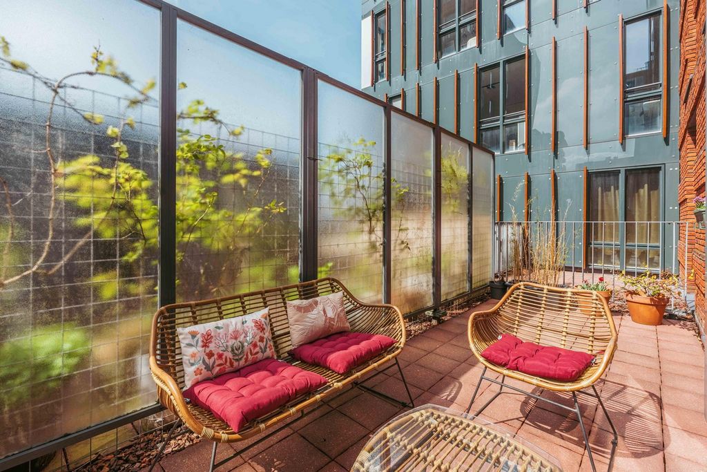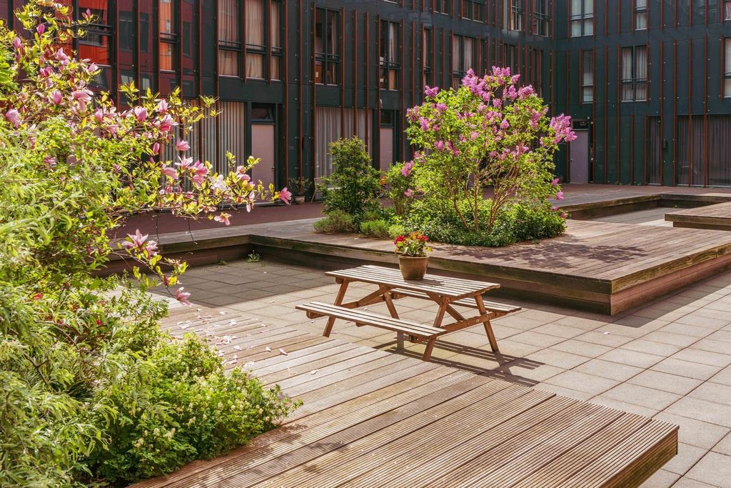 O espaçoso hall de recepção leva a um segundo corredor que dá acesso à generosa área de estar com cozinha aberta. Graças às janelas de largura total e do chão ao teto na frente, você desfrutará de vistas fenomenais sobre o IJ. As portas duplas na parte traseira se abrem para o terraço ensolarado voltado para o oeste de aproximadamente 14 m² - um local agradável para relaxar ao ar livre.