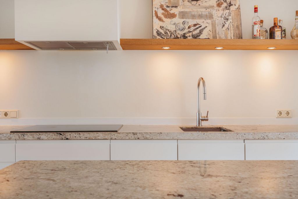 The spacious reception hall leads into a second hallway that provides access to the generous living area with open kitchen. Thanks to the full-width and floor-to-ceiling windows at the front, you'll enjoy phenomenal views over the IJ. Double doors at the rear open onto the sunny west-facing terrace of approximately 14 m² – a delightful spot to relax outdoors.