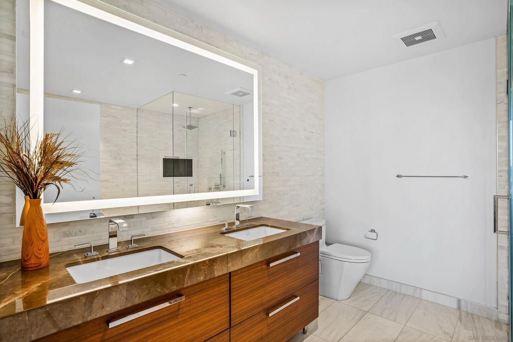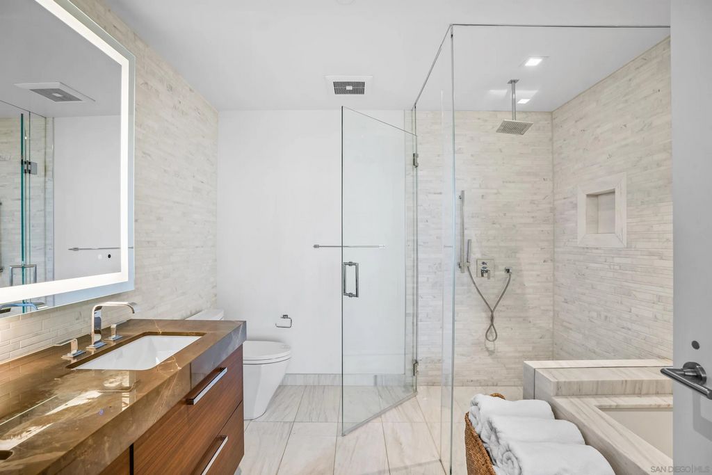 Bienvenido al estilo de vida The Ultimate Luxury, una residencia de primer nivel en la esquina noroeste en la única torre residencial Super Prime de San Diego, Pacific Gate. Residence 1101 ofrece un diseño espacioso con 2 dormitorios más estudio, 2.5 baños y un diseño cuidadoso que captura impresionantes vistas panorámicas de la Bahía de San Diego, el Océano Pacífico y el horizonte de la ciudad. El amplio diseño abierto es perfecto para el entretenimiento, con una amplia terraza privada donde puede relajarse mientras observa la puesta de sol sobre el paseo marítimo. La cocina inspirada en el chef es una obra maestra, con electrodomésticos Wolf y Miele de primera calidad, encimeras Caesarstone y elegantes gabinetes personalizados. Los hermosos pisos de madera y los tratamientos e iluminación mejorados de las ventanas agregan calidez y elegancia en todo el espacio. La lujosa suite principal cuenta con ventanas del piso al techo, un baño tipo spa y un generoso vestidor. Una suite de invitados separada ofrece impresionantes vistas al agua, mientras que un espacio de estudio / oficina brinda flexibilidad para una oficina en casa o un dormitorio adicional. Las comodidades del resort de lujo incluyen un yate compartido de 45 pies, flota de automóviles de lujo, conserje las 24 horas, los 7 días de la semana, una suite para invitados, terraza con cabañas, salón para residentes con cocina de catering, un gimnasio de última generación con sauna y baño de vapor, sala de proyección, parque para perros y un restaurante propiedad de un famoso chef en el lugar. Disfrute del estilo de vida de lujo costero en la única torre residencial Super Prime de San Diego. Pacific Gate está ubicado en Millionaire's Row y a pasos del puerto, Seaport Village, Rady Shell, restaurantes y boutiques de lujo.