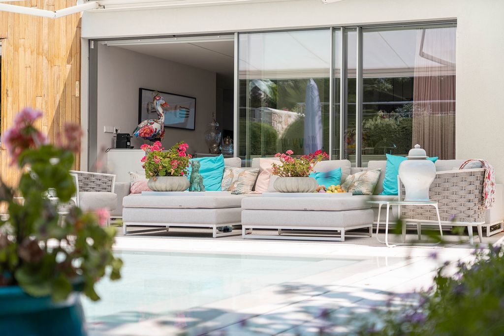 Todo el piso está rodeado de terrazas con varias salidas: desde el salón, el dormitorio principal y una gran terraza abierta en la parte trasera, conectada directamente con la piscina.