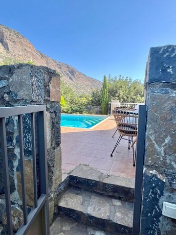 It comprises on the ground floor of an open plan kitchen/living room area. Large windows invite natural light and offer views of the surrounding landscape. From here, access the courtyard via two small outdoor staircases, where you'll find a cozy dining/lounge area complete with a jacuzzi and outdoor fireplace/BBQ.Adjacent to the main entrance, the courtyard leads to a relaxing pool and lounge/sitting area, protected by a wooden pergola, offering a perfect spot for lounging. The area is further enhanced by a lush garden with a variety of small trees, creating an intimate and peaceful environment.