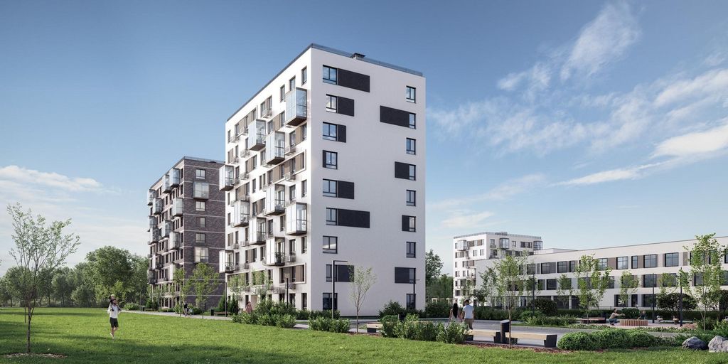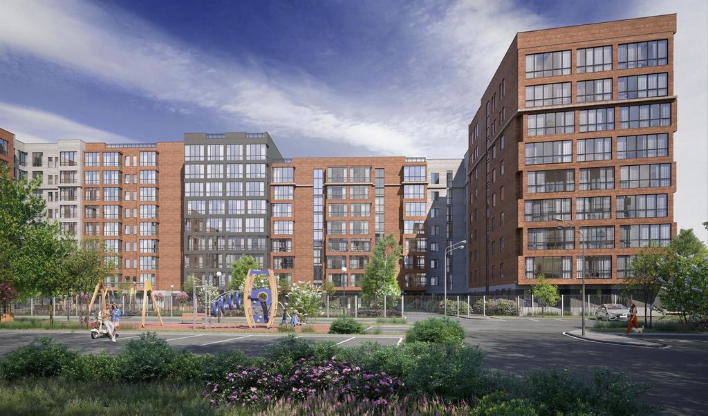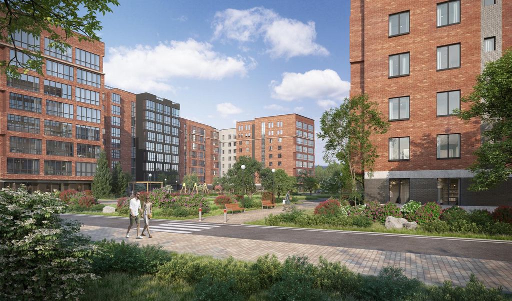 Корпуса высотой 7–10 этажей с фасадами в природных оттенках. Приватные дворы-парки без машин — с тренажерами и детскими площадками. Есть зеленый бульвар и сквер для отдыха. Предусмотрен открытый паркинг.