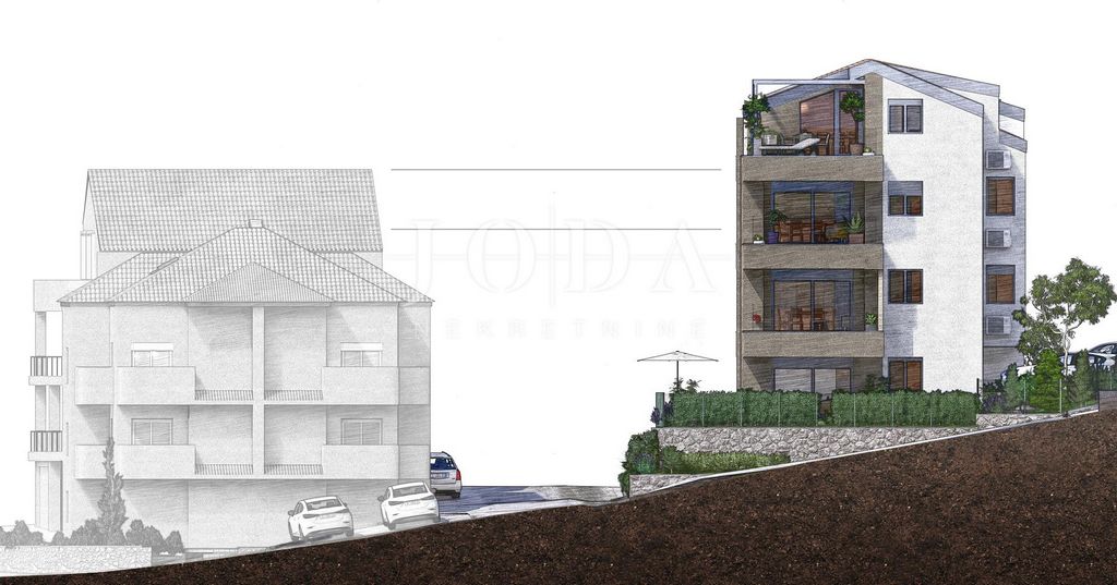 Apartma v pritličju ima velik vrt, vsi ostali apartmaji pa imajo čudovite balkone in čudovit pogled na morje. Načrtovani zaključek del je poletje 2026.